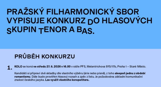 Pražský filharmonický sbor vyhlašuje konkurz do hlasových skupin tenor a bas. Nabízíme stabilní pracovní místo na plný úvazek s možností účasti na atraktivních koncertech v ČR i v zahraničí. Zároveň vás čeká spolupráce s předními umělci a příprava pod vedením špičkových sbormistrů a dirigentů.